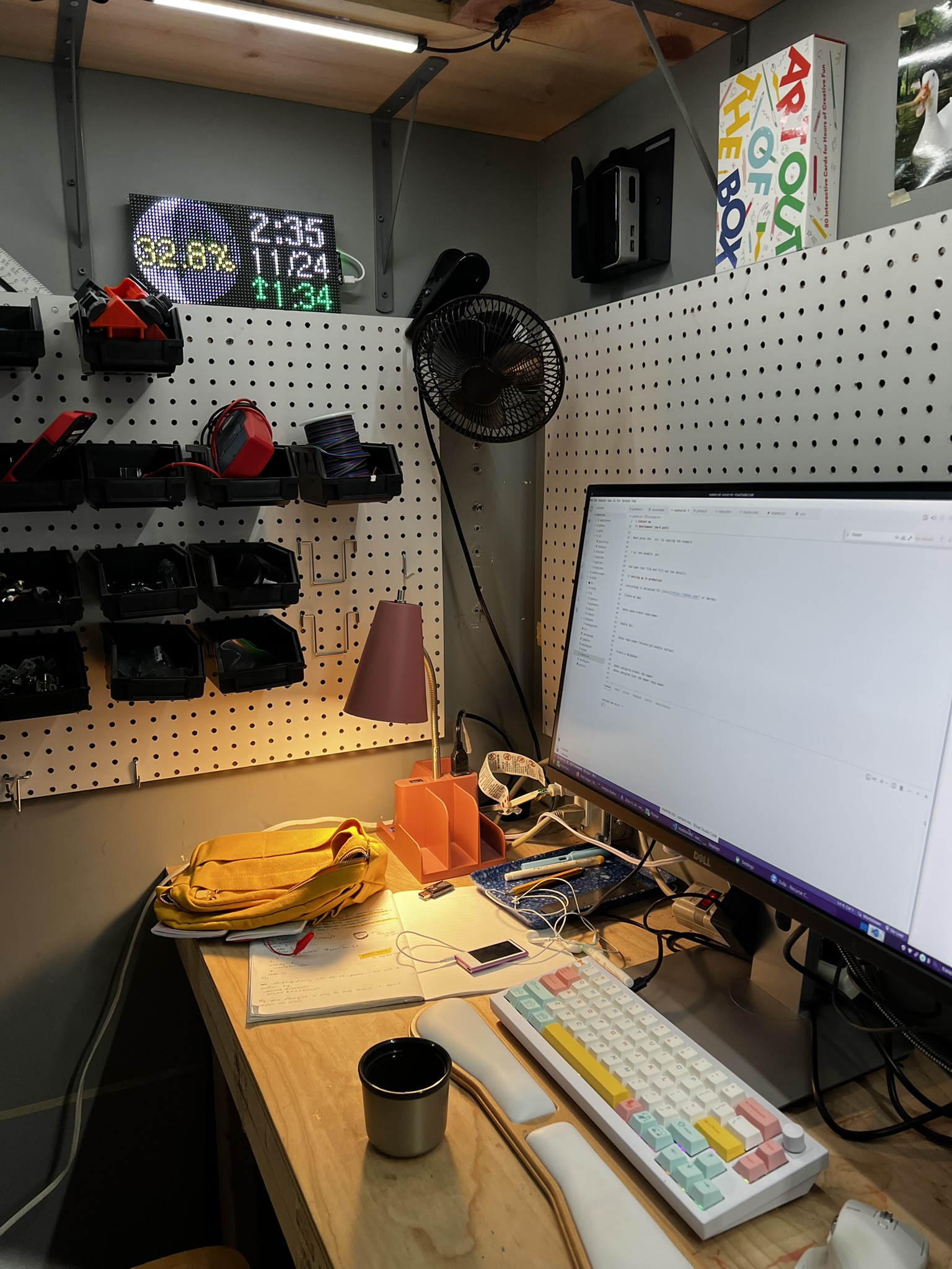 Now that Iām back home Iām working on a workspace in my garage. Itās a nice space because it has tools (3D printing! hand tools! Crafting tools! computer bits!) but also Iām not sure if itās the healthiest air environment. I have a thermometer stuck to the wall and I can see the current temperature in here (72 as Iām writing). I want to build a little sensor to keep track of air quality.